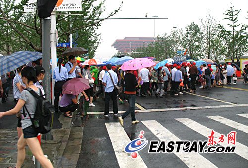 6號門入口外的志愿者服務(wù)站站長汪愛華則從專業(yè)服務(wù)人員的角度為記者分析了入園人數(shù)爆棚的現(xiàn)象,她認(rèn)為上海居民手中世博大禮包6月票的時(shí)限將近、外地游客報(bào)旅行社早已定好時(shí)間以及海外游人數(shù)量的增加是主要客觀原因,而人們不約而同地認(rèn)為“雨天人少我們快去”則是出于主觀。“大雨澆不滅游人的熱情,只是大家湊巧想到了一起而已!