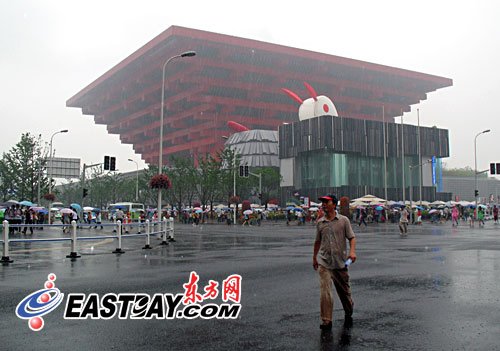6月29日上午11時(shí)左右,一位男游客不打傘走在雨中,身后的中國館下人頭攢動(dòng)