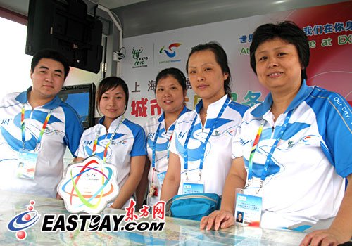 左起:6號門志愿者站的當(dāng)班志愿者劉陽林、梁紅、錢敏秀、陳慧華、汪愛華