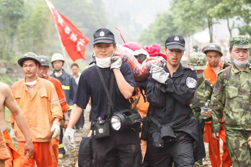 5月17日下午18時(shí)30分,深圳特警隊(duì)們扛著一名重傷男子在隨時(shí)可能發(fā)生滑坡的山路上步行了7個(gè)多小時(shí)后,終于將他送到了紅白鎮(zhèn)救災(zāi)醫(yī)療隊(duì)。