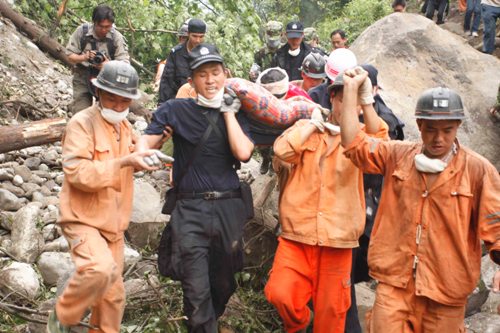 由于本身帶了較重的裝備,加上沉重的重要物資,還要扛上一個(gè)重傷員,在山路上行走的特警隊(duì)們顯得特別吃力。山上不斷有碎石滾下,特警隊(duì)員們就用自己的身體護(hù)在小周身上。天氣預(yù)報(bào)說(shuō)17日德陽(yáng)地區(qū)會(huì)有大到暴雨,一旦下起雨來(lái),山路上的行進(jìn)將更加艱難。
