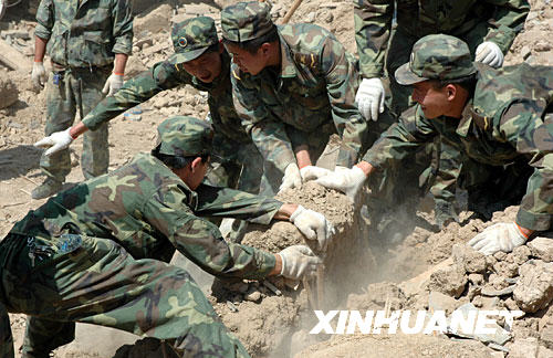 5月16日,解放軍官兵在隴南地震災(zāi)區(qū)清理房屋廢墟。 新華社記者 連振祥 攝