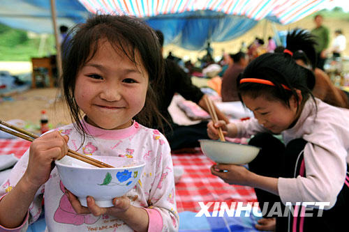 5月13日,兩名小姑娘在陜西省寧強(qiáng)縣青木川鎮(zhèn)輔仁中學(xué)安置點(diǎn)吃午餐。新華社記者 陶明 攝