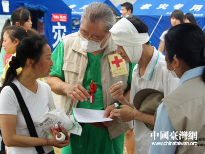 20日下午,臺灣紅十字組織醫(yī)療隊帶約3噸醫(yī)療用品等物資前往廣漢市,21日在高坪鎮(zhèn),23日在體育場救災(zāi)點設(shè)立醫(yī)療救護(hù)站,展開救護(hù)服務(wù)。救護(hù)站設(shè)有中、西醫(yī)。從21日至24日共計診治476名。對數(shù)十名老弱災(zāi)民進(jìn)行體檢,做了一臺氣胸手術(shù)、兩個骨折手術(shù)。和一個頭皮縫合小手術(shù)。內(nèi)、外科,兒科,針灸,急處方發(fā)藥點。巴蜀音像制作中心 蘭志泉 攝
