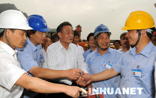 5月28日,中共中央政治局常委、全國人大常委會委員長吳邦國來到受災(zāi)嚴(yán)重的綿竹市漢旺鎮(zhèn)、平武縣平通鎮(zhèn)等地察看災(zāi)情,看望企業(yè)職工和學(xué)校師生,慰問災(zāi)區(qū)干部群眾和來自四面八方的救援人員。這是吳邦國在東方汽輪機(jī)廠漢旺基地與從廢墟中被救出的主機(jī)一分廠廠長喻剛親切握手。 新華社記者饒愛民攝