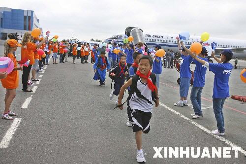 當(dāng)?shù)貢r(shí)間17日下午,從北京乘國航包機(jī)直飛俄羅斯進(jìn)行療養(yǎng)的91名四川地震災(zāi)區(qū)中小學(xué)生抵達(dá)俄遠(yuǎn)東城市符拉迪沃斯托克。這些孩子走下飛機(jī)舷梯時(shí),前往機(jī)場迎接的俄羅斯近百名學(xué)生高呼“歡迎來到俄羅斯”。