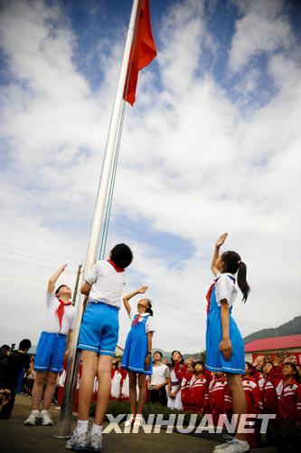 資料圖片:6月23日,在都江堰市過(guò)渡校點(diǎn)“皖川學(xué)!保瑢W(xué)們?cè)趶?fù)課第一天舉行升國(guó)旗儀式。