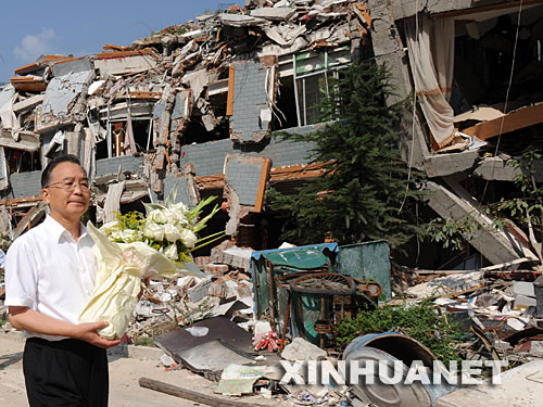 9月1日,溫家寶徒步一個小時,進(jìn)入地震中慘遭滅頂之災(zāi)的北川縣城,在遇難者集體掩埋處向遇難者獻(xiàn)花。新華社記者 黃敬文攝