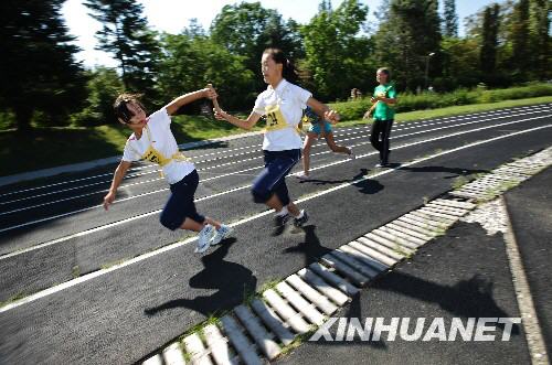 8月3日,在俄羅斯南部黑海之濱圖阿普謝的“小鷹”全俄兒童中心,正在這里療養(yǎng)的四川地震災區(qū)學生與俄羅斯學生一起參加4×100米接力賽。當日,“小鷹”全俄兒童中心舉行運動會,中俄學生同場競技,一展風采。新華社記者沈伯韓攝