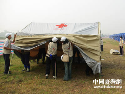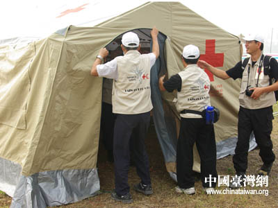 臺灣紅十字組織醫(yī)療隊在搭建醫(yī)療帳篷