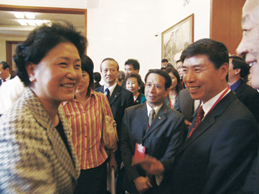 圖1全國(guó)政協(xié)副主席、中央統(tǒng)戰(zhàn)部部長(zhǎng)、中國(guó)和平統(tǒng)一促進(jìn)會(huì)執(zhí)行副主席劉延?xùn)|與會(huì)議代表親切交談。