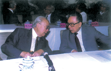 圖1錢偉長(zhǎng)會(huì)長(zhǎng)(左)與全國(guó)政協(xié)副主席吳學(xué)謙在主席臺(tái)親切交談。