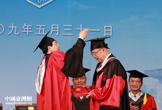 中國科學院院士、南京大學學位評定委員會副主任吳培亨宣讀了授予吳伯雄先生法學名譽博士學位決定。由南京大學校長、校學位評定委員會主任陳俊向吳伯雄頒授法學名譽博士學位證書、挑正流蘇。(記者 鐘寶華)