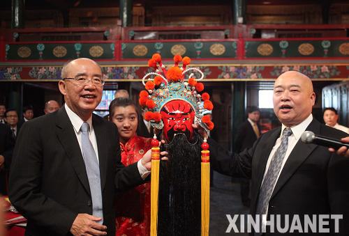 5月25日,中國國民黨主席吳伯雄在北京湖廣會(huì)館接受湖廣會(huì)館館長贈(zèng)送的關(guān)公臉譜。當(dāng)日,中國國民黨主席吳伯雄率領(lǐng)中國國民黨大陸訪問團(tuán)抵達(dá)北京,開始訪問大陸行程。吳伯雄一行當(dāng)天下午參觀了北京湖廣會(huì)館。新華社記者 邢廣利 攝