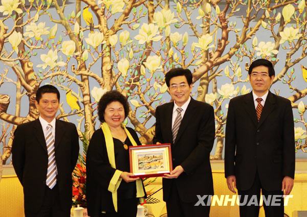 5月21日,陳菊向郭金龍贈(zèng)送禮品。當(dāng)日,北京市市長郭金龍?jiān)诒本╋埖陼?huì)見高雄市市長陳菊及高雄世運(yùn)觀光行銷團(tuán)一行。新華社記者 邢廣利 攝