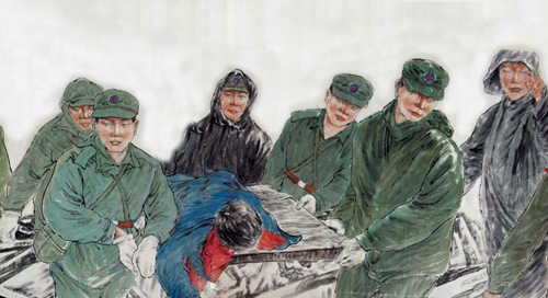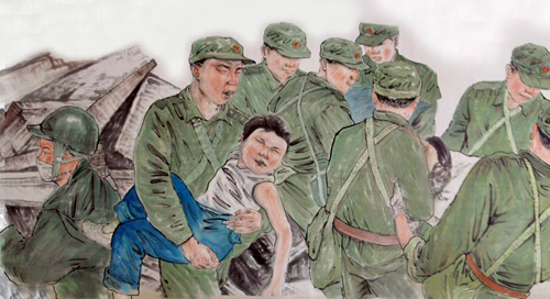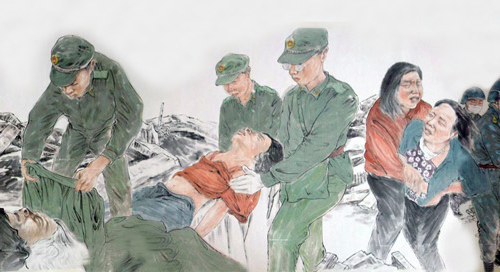 畫卷以解放軍戰(zhàn)士正從廢墟中救人的畫面開頭,中間穿插了上百組救災(zāi)過程中的感人場面。敬禮娃娃郎錚、芭蕾女孩李月、英勇的解放軍戰(zhàn)士、善良的白衣天使等在四川汶川大地震中備受關(guān)注的人物,均被郭永潔用畫筆記錄在畫卷上,畫面最后定格在救援人員抬著擔(dān)架爬坡的場景上。