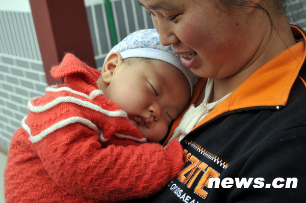 5月6日,2個月大的楊遠志在媽媽懷中酣睡。當天,“地震周年網(wǎng)絡媒體災區(qū)行”采訪活動來到四川省都江堰市向峨鄉(xiāng)棋盤村永久性住房安置點。楊遠志是災后出生的小寶寶,目前他和家人所住的新家水、電、氣、光纖等生活設(shè)施一應俱全。新華網(wǎng) 前衛(wèi) 攝