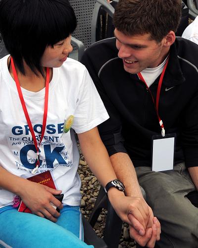 5月11日,在四川安縣“真情大愛·回到災區(qū)再看看”致謝活動現(xiàn)場,美國志愿者但以理和戀人、中國志愿者董明珠交談。兩人在去年地震災區(qū)志愿服務活動中相識相愛。時值汶川大地震一周年之際,但以理特意從美國飛回四川安縣,與在災區(qū)堅持服務了近一年的董明珠相聚,并在災區(qū)學校教孩子們學英語。新華社記者王茜攝