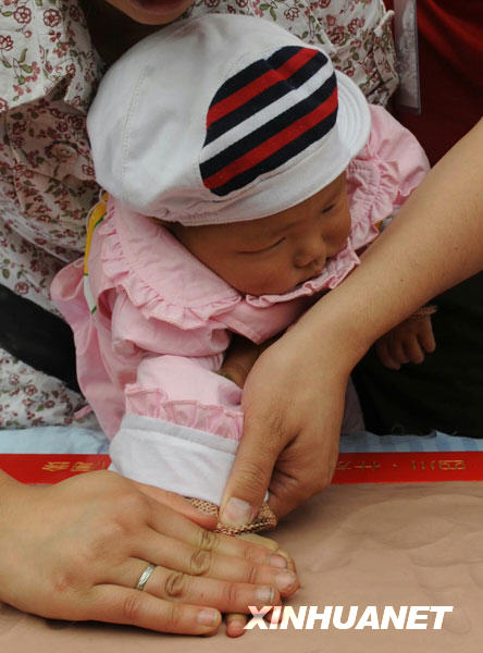 5月13日,地震“羅漢娃”在生日抓周會上按手模。新華社記者陳燮攝