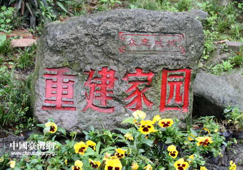 都江堰安置點內(nèi)的石碑,激勵民眾團結努力,重建家園。(中國臺灣網(wǎng) 高斯斯 攝)