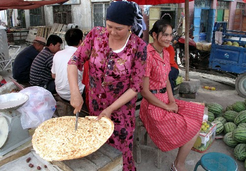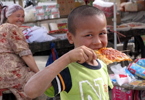 7月14日,庫車縣齊滿鎮(zhèn)的小朋友玉素甫江在巴扎上品嘗特制的麻辣烤馕。 新疆維吾爾族趕巴扎有著悠久的歷史,特別是在塔里木地區(qū),“巴扎日”在各縣鄉(xiāng)鎮(zhèn)輪流舉行,當(dāng)?shù)鼐用裢ㄟ^趕巴扎不僅買賣商品,也獲取各種信息。7月14日是庫車縣齊滿鎮(zhèn)的“巴扎日”,格外熱鬧。 新華社記者 沈橋 攝