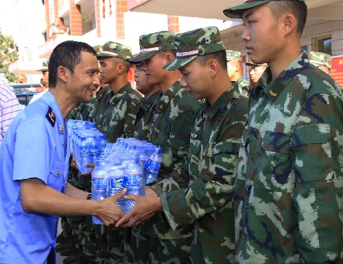 7月14日,新疆喀什疏勒縣工商行政管理局干部(左一)向執(zhí)勤的武警官兵送上飲用水。當(dāng)日,新疆喀什疏勒縣工商行政管理局員工和疏勒縣私營個體協(xié)會會員慰問執(zhí)勤的武警官兵,為他們送去飲用水、西瓜等慰問品。 新華社記者 李明放 攝