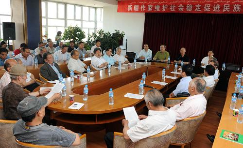7月16日,100余名新疆各民族知名作家、藝術(shù)家在新疆維吾爾自治區(qū)文聯(lián)召開維護(hù)社會(huì)穩(wěn)定促進(jìn)民族團(tuán)結(jié)座談會(huì),嚴(yán)正聲討“7·5”打砸搶燒嚴(yán)重暴力犯罪事件,重申了維護(hù)社會(huì)穩(wěn)定促進(jìn)民族團(tuán)結(jié)的重要性。與會(huì)各族作家、藝術(shù)家在《中國(guó)新疆作家、藝術(shù)家告世界書》上簽下自己的名字。 新華社記者 金良快 攝