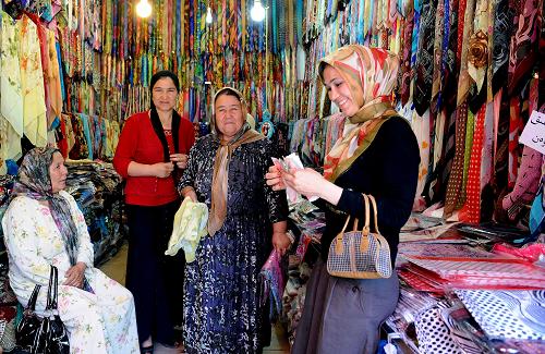 7月19日,在烏魯木齊市山西巷,維吾爾族婦女在挑選頭巾。 新華社記者 沙達(dá)提 攝