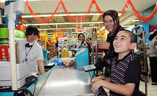 7月23日,市民在家樂福烏魯木齊大巴扎店購物。當日,自烏魯木齊“7·5”事件后閉店17天的家樂福烏魯木齊大巴扎店重新開門營業(yè)。新華社記者 沙達提 攝
