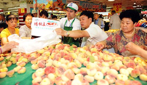7月23日,顧客在家樂福烏魯木齊大巴扎店挑選蟠桃。新華社記者 沙達提 攝