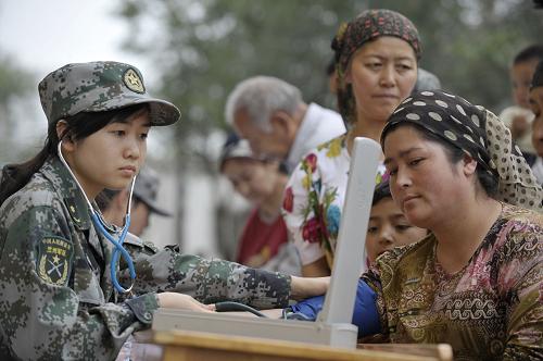 7月23日,解放軍第二十三醫(yī)院醫(yī)務(wù)人員為烏魯木齊八戶梁社區(qū)一位居民量血壓。當(dāng)日,解放軍第二十三醫(yī)院醫(yī)務(wù)人員來到烏魯木齊八戶梁社區(qū)開展義診活動(dòng),社區(qū)內(nèi)上百位各族居民前來問診,軍醫(yī)們還為當(dāng)?shù)刭?zèng)送了一些常用藥品。新華社記者 趙戈 攝