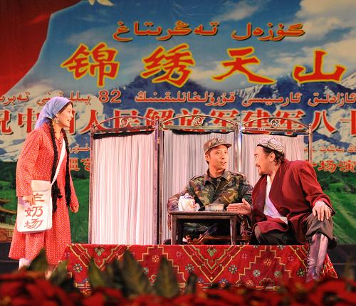 7月29日,新疆藝術(shù)劇院話劇團(tuán)演員在表演小品《保險(xiǎn)》。當(dāng)晚,由新疆維吾爾自治區(qū)文化廳主辦的《錦繡天山》慶祝八一建軍節(jié),慰問(wèn)武警、公安干警文藝晚會(huì)在新疆藝術(shù)劇院上演,精彩的文藝表演贏得在場(chǎng)官兵的熱烈掌聲。 新華社記者 沙達(dá)提 攝