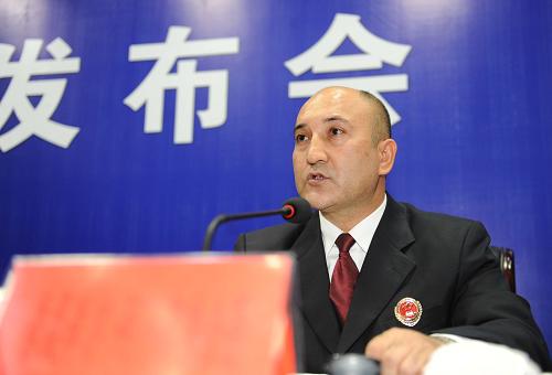 8月4日,烏魯木齊市人民檢察院檢察長吾提庫爾·阿不都熱合曼在新聞發(fā)布會(huì)上通報(bào)情況。當(dāng)日,吾提庫爾·阿不都熱合曼在烏魯木齊舉行的新聞發(fā)布會(huì)上宣布,截至8月3日,經(jīng)檢察機(jī)關(guān)嚴(yán)格依法審核、查證,烏魯木齊“7·5”事件首批83名犯罪嫌疑人被批準(zhǔn)逮捕。 新華社記者 沙達(dá)提 攝