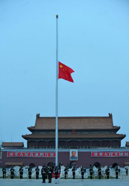 4月21日,北京天安門廣場下半旗,向玉樹地震遇難同胞致哀。 新華社記者羅曉光攝