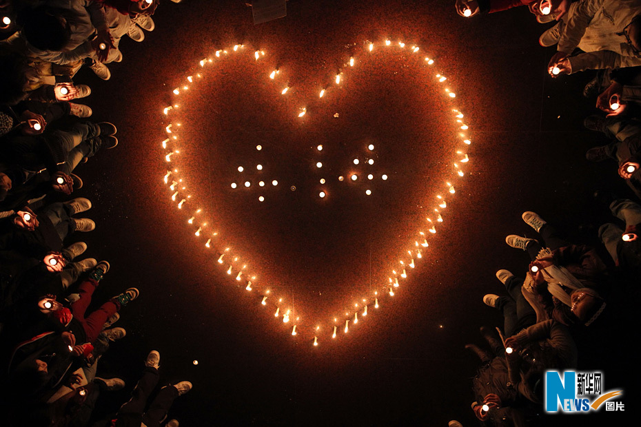 4月20日晚,江蘇省南通大學(xué)學(xué)生在“玉樹,我們一直在”祈;顒又悬c亮蠟燭,哀悼逝者。 新華社發(fā)(許叢軍 攝)
