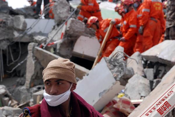 15日早晨,玉樹縣城坍塌的民族賓館廢墟上,100多名救援者手刨31個小時,硬是從四層樓高的碎石堆中刨出一個三米深的大坑,就是為了一個微弱的生命氣息。