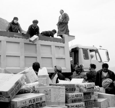 4月18日,由青海省天峻縣群眾捐助的物資,發(fā)放到災(zāi)區(qū)群眾手中。(記者 李琛奇 攝)