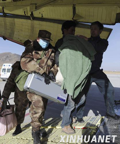 4月18日,家屬和救援人員護送早產(chǎn)嬰兒登機。當日9時10分,剛抵達玉樹機場、正在卸運救災物資的廣空運輸航空兵某師劉軍機組得知,藏族婦女尼瑪拉毛懷孕八個多月發(fā)生早產(chǎn),孩子全身紫疳生命垂危,急需轉往蘭州軍區(qū)總醫(yī)院。在完成物資卸運后,機組成員火速準備,9時25分,飛機搭載著早產(chǎn)嬰兒從玉樹機場順利起飛。新華社發(fā)(沈玲 攝)