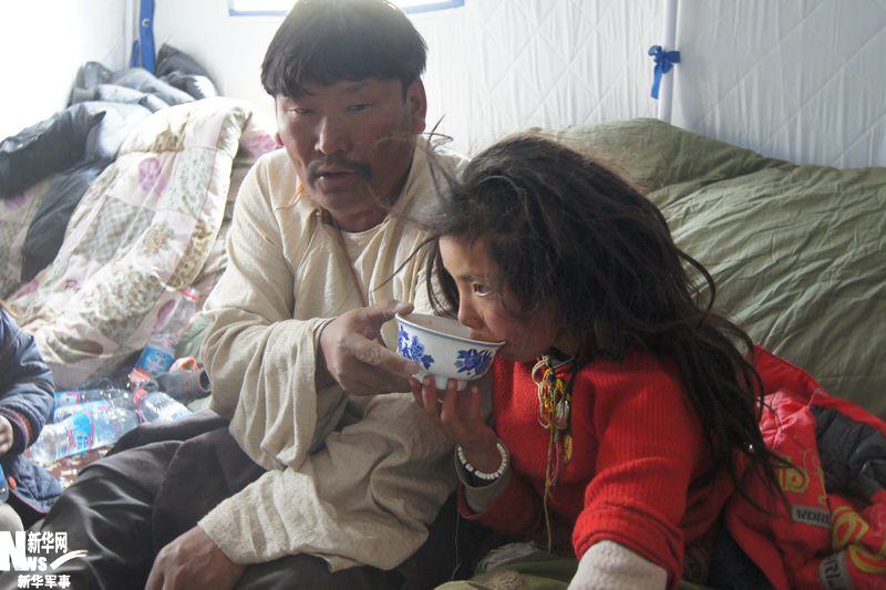 小女孩的舅舅在給她喂奶茶。新華軍事記者 王玉山 攝