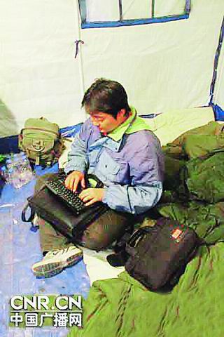 青海記者站站長馬玉宏和甘肅記者站站長李琛奇在14日地震發(fā)生后,當即連夜趕到青海玉樹地震災區(qū),克服了夜里零下十幾度的艱苦條件,以最快時間實現(xiàn)了通訊設(shè)備、電力照明和網(wǎng)絡(luò)傳輸?shù)恼_\行,并為后續(xù)采訪小組搭建起住宿帳篷。