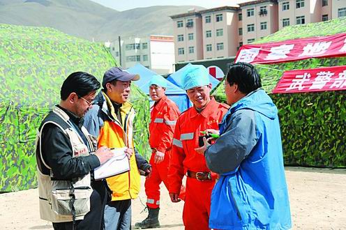 此刻,人民日報、新華社、光明日報、經(jīng)濟日報、中央人民廣播電臺、中央電視臺、中國國際廣播電臺、中國日報等中央媒體的200多位記者正奮戰(zhàn)在玉樹抗震救災前線——