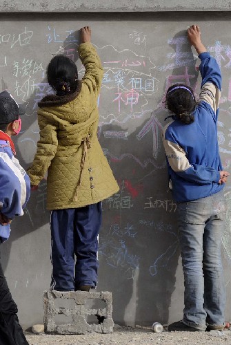 在青海省玉樹(shù)縣結(jié)古鎮(zhèn)新建路,有一段地震中幸存的水泥墻。近兩天,這段墻下多了兩個(gè)藏族小姐妹,她倆把墻當(dāng)成黑板,用彩色粉筆在上面寫(xiě),在上面畫(huà),使這段墻成了姐妹倆表達(dá)對(duì)抗震救災(zāi)真實(shí)感受的“心聲墻”。