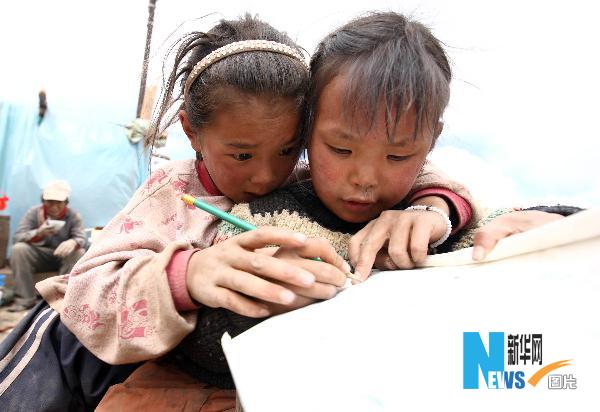 4月21日,俄德才仁的女兒成林巴措(左)在教妹妹認字。 家住玉樹結(jié)古鎮(zhèn)扎西大同村的俄德才仁在地震中失去了自己的妻子和遮風避雨的家,如今剩下6個未成年的孩子需要他一人獨立撫養(yǎng)。俄德才仁現(xiàn)在最大的愿望就是把房子的廢墟清理出來,在上面重新建起自己的家。 “估計什么時間能夠把這房子建起來?”記者問俄德才仁,“應該會很快,因為政府會幫助我們! 新華社記者 費茂華 攝