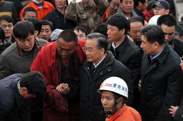 這是溫家寶在青海省玉樹縣結(jié)古鎮(zhèn)看望慰問災區(qū)群眾。 新華社記者王鵬攝
