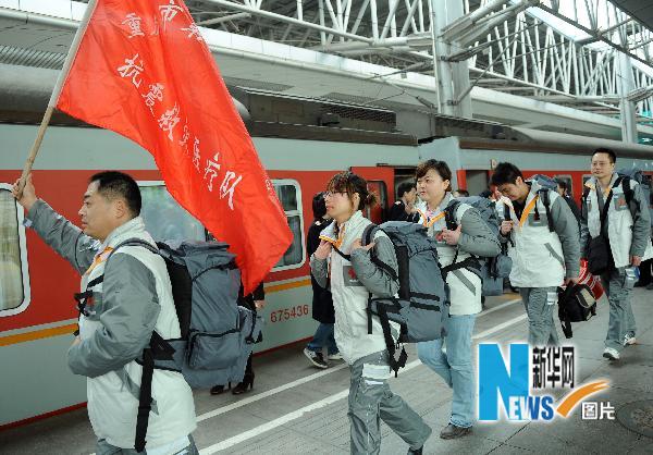 4月15日,醫(yī)療隊(duì)員正在登上列車。當(dāng)日,重慶市由179人組成的首批醫(yī)療隊(duì)正式出發(fā),乘專列趕赴青海地震災(zāi)區(qū)。這支醫(yī)療隊(duì)由20家醫(yī)療機(jī)構(gòu)的醫(yī)務(wù)人員組成,帶有30輛救護(hù)車和部分醫(yī)療救援藥品。另外,重慶市還有數(shù)支醫(yī)療隊(duì)正整裝待發(fā)。新華社記者 周衡義 攝