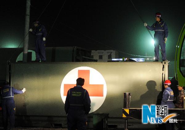4月25日晚,在玉樹(shù)體育場(chǎng)安置點(diǎn),重型起重機(jī)在吊運(yùn)野戰(zhàn)醫(yī)院方艙。當(dāng)晚,徐工集團(tuán)玉樹(shù)抗震救援隊(duì)與濟(jì)南軍區(qū)野戰(zhàn)方艙醫(yī)院合作,連夜吊運(yùn)、調(diào)整現(xiàn)有方艙醫(yī)院格局。濟(jì)南軍區(qū)野戰(zhàn)方艙醫(yī)院自4月22日運(yùn)抵玉樹(shù)災(zāi)區(qū),由于地域限制,一直無(wú)法發(fā)揮其最大功能。25日晚,該野戰(zhàn)方艙醫(yī)院連夜全面展開(kāi),預(yù)計(jì)將在午夜前全部布置完畢,完全不影響藏族群眾第二天就診。此后,該方艙醫(yī)院將一直保留在玉樹(shù)災(zāi)區(qū),直到當(dāng)?shù)蒯t(yī)院重建完成。新華社記者郭磊攝