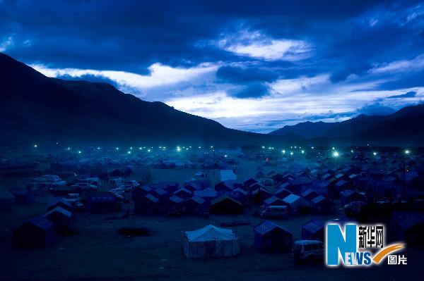 夜幕中的賽馬場(chǎng)受災(zāi)群眾安置點(diǎn)被新架設(shè)的電燈照亮(4月24日攝)。玉樹地震災(zāi)區(qū)賽馬場(chǎng)安置點(diǎn)位于玉樹藏族自治州結(jié)古鎮(zhèn)北側(cè)約8公里處,四周高山圍繞,地勢(shì)開闊平坦,長(zhǎng)約10公里,寬約2公里,是震區(qū)規(guī)模最大的受災(zāi)群眾安置點(diǎn)。這里大大小小的帳篷里住滿了來自玉樹各縣的約3萬名受災(zāi)群眾。每當(dāng)夜幕降臨,賽馬場(chǎng)安置點(diǎn)新安裝的近200盞高功率室外照明燈一齊點(diǎn)亮,成百上千頂帳篷在大山腳下若隱若現(xiàn)。安置點(diǎn)的藏族群眾陸續(xù)來到賽馬場(chǎng)高高的看臺(tái)上,點(diǎn)燃酥油燈,低聲祈禱,懷念親人、祝福朋友。新華社記者 劉杰 攝