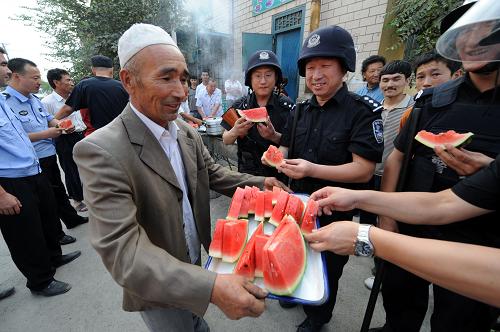 7月14日,居民阿米娜為特警隊員送上自己烤制的羊肉串。紅廟子平頂山是烏魯木齊市的一個多民族聚居區(qū)。“7·5”打砸搶燒嚴(yán)重暴力犯罪事件發(fā)生后,在此執(zhí)勤的特警隊員們沉著冷靜地維護(hù)民族團(tuán)結(jié)、維護(hù)社會穩(wěn)定,及時化解民族矛盾,排除各種不穩(wěn)定因素;利用一切時機深入各族群眾中,挨家挨戶耐心做思想教育和民族政策宣傳工作,幫助居民及時認(rèn)清“7·5”事件真相和境外“三股勢力”挑起民族矛盾的險惡用心。不懈努力,逐散陰霾,各民族居民又開始相互往來交流,平頂山又恢復(fù)了往日的融洽與寧靜。而這些維穩(wěn)使者們用行動和真誠贏得了民族聚居區(qū)群眾的信任,并與他們結(jié)下了深厚的友誼。新華社記者 李紫恒 攝