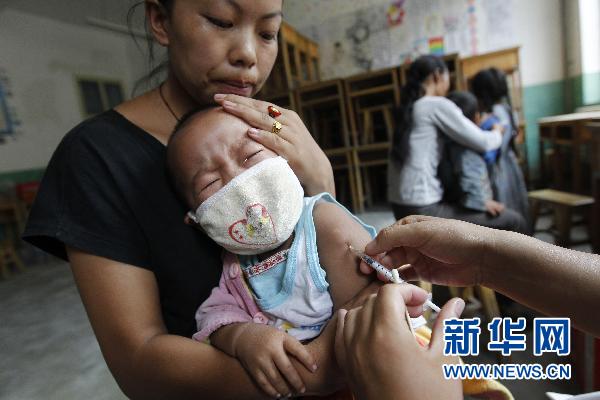 8月18日,在甘肅舟曲縣城獨立中學受災群眾安置點,醫(yī)務人員在為幼兒接種甲肝疫苗。鑒于舟曲災區(qū)目前的衛(wèi)生和疾病預防形勢,甘肅省、甘南藏族自治州、舟曲縣三級疾控中心自8月16日開始,為災區(qū)1歲半至6歲的幼兒大面積接種甲肝疫苗,防止甲肝疾病的發(fā)生。截至8月18日12時,已有約500名幼兒接種了甲肝疫苗。新華社記者 任正來 攝