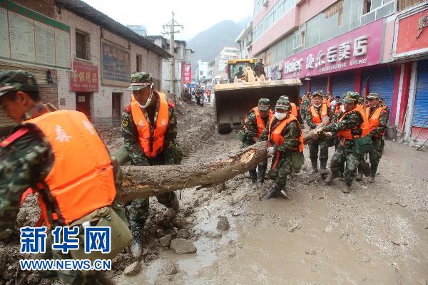 8月17日,在舟曲縣城主街道,武警甘肅森林總隊(duì)官兵在水電部隊(duì)大型機(jī)械配合下開展清淤工作。當(dāng)日,甘肅舟曲特大山洪泥石流災(zāi)害搶險(xiǎn)救援進(jìn)入第十天,武警甘肅森林總隊(duì)官兵在江邊和縣城主要街道實(shí)施人工清淤。戰(zhàn)士們利用鐵鍬、鎬頭和推車等工具,全面清理泥沙和淤泥,并將部分泥濘的街道鋪上石子。新華社發(fā)(龐紅升 攝)